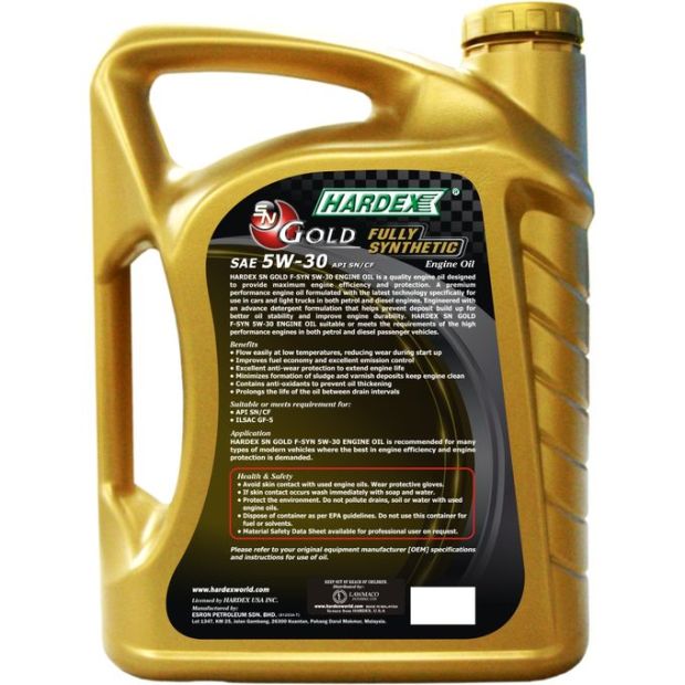 A quality engine oil designed to provide maximum engine efficiency and protection. A premium performance engine oil formulated with the latest technology specifically for use in cars and light trucks in both petrol and diesel engines. Engineered with an advance detergent formulation that helps prevent deposit build up for better oil stability and improve engine durability. HARDEX SN GOLD FULLY SYNTHETIC Engine Oil SAE 5W-30 is suitable or meets requirement of the high-performance engines in both petrol and diesel passenger vehicles.