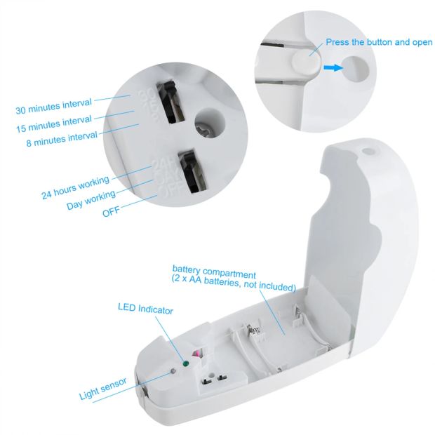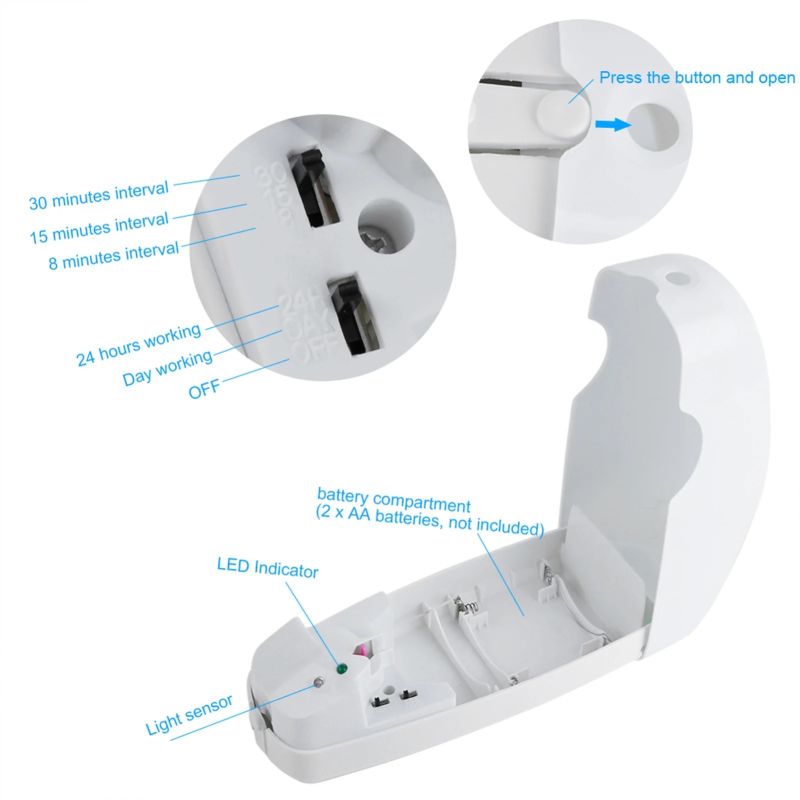 This automatic aerosol dispenser is made of high quality ABS material, with modern and simple design. It is used for spraying fragrance automatically according to your setting. No need spray manually, more convenient and labor saving. Easy to use, purify the indoor air and create a comfortable environment.