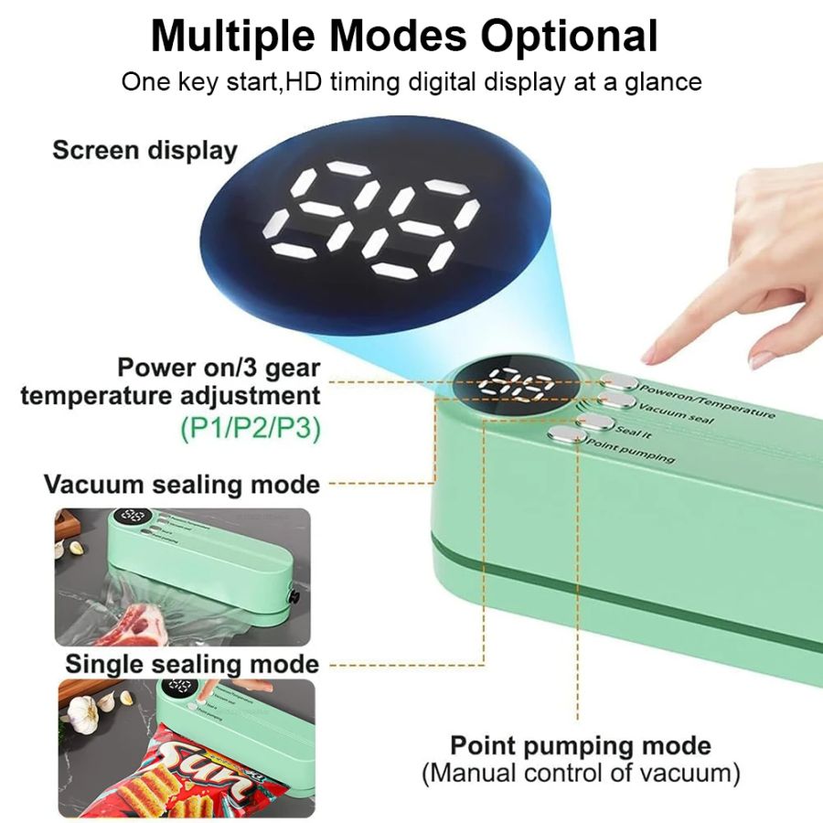 【3 Modes for Daily Use】 "Vacuum Seal" mode: one-touch automatic vacuum and seal, suitable for food that is not easily deformed, such as meat, nuts, and vegetables; "Seal it" mode: only seal, for chip bags or pet food bags; "Point pumping" mode:control the vacuuming process by yourself then seal it, suitable for soft food or moist food.