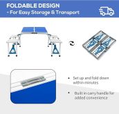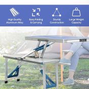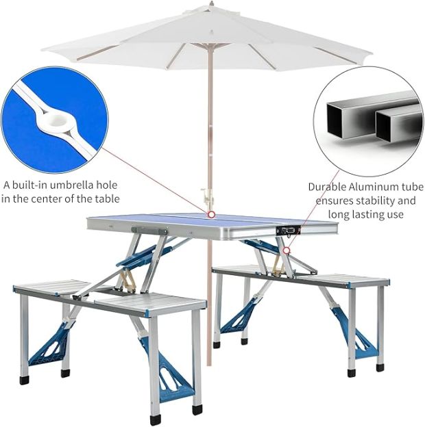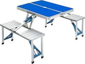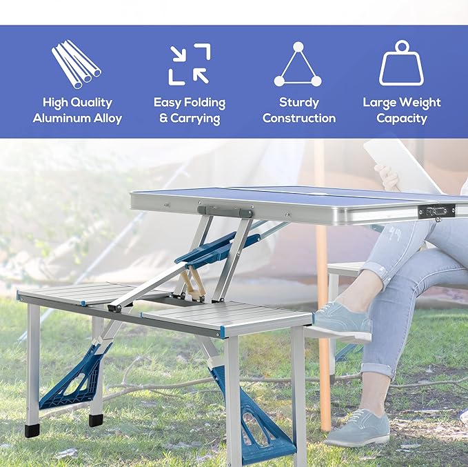 This portable and lightweight camping table and chair set is perfect for outdoor activities like picnics, camping, and beach trips. The sturdy aluminum frame and durable tabletop make it ideal for dining, playing games, or simply relaxing outdoors.